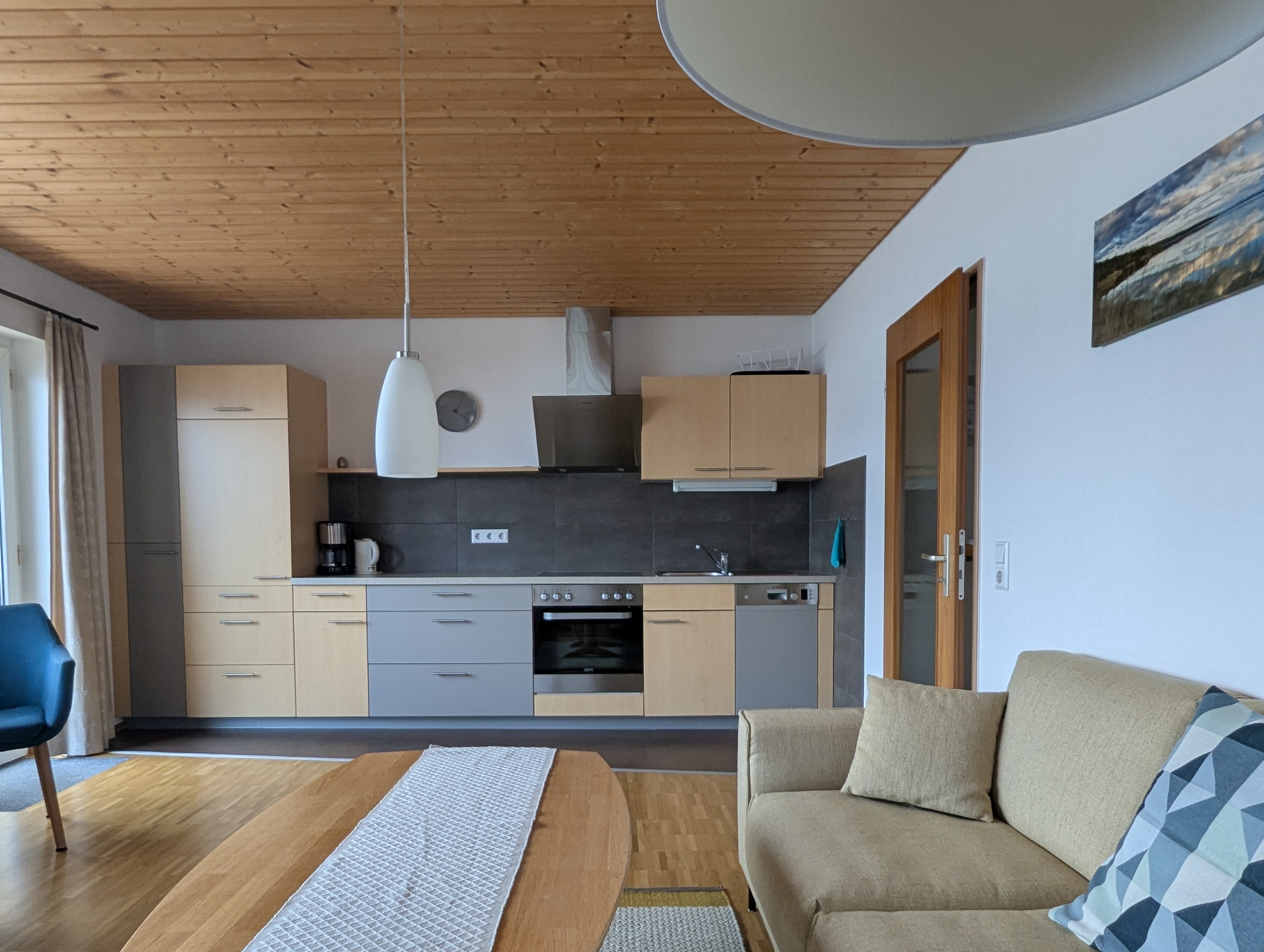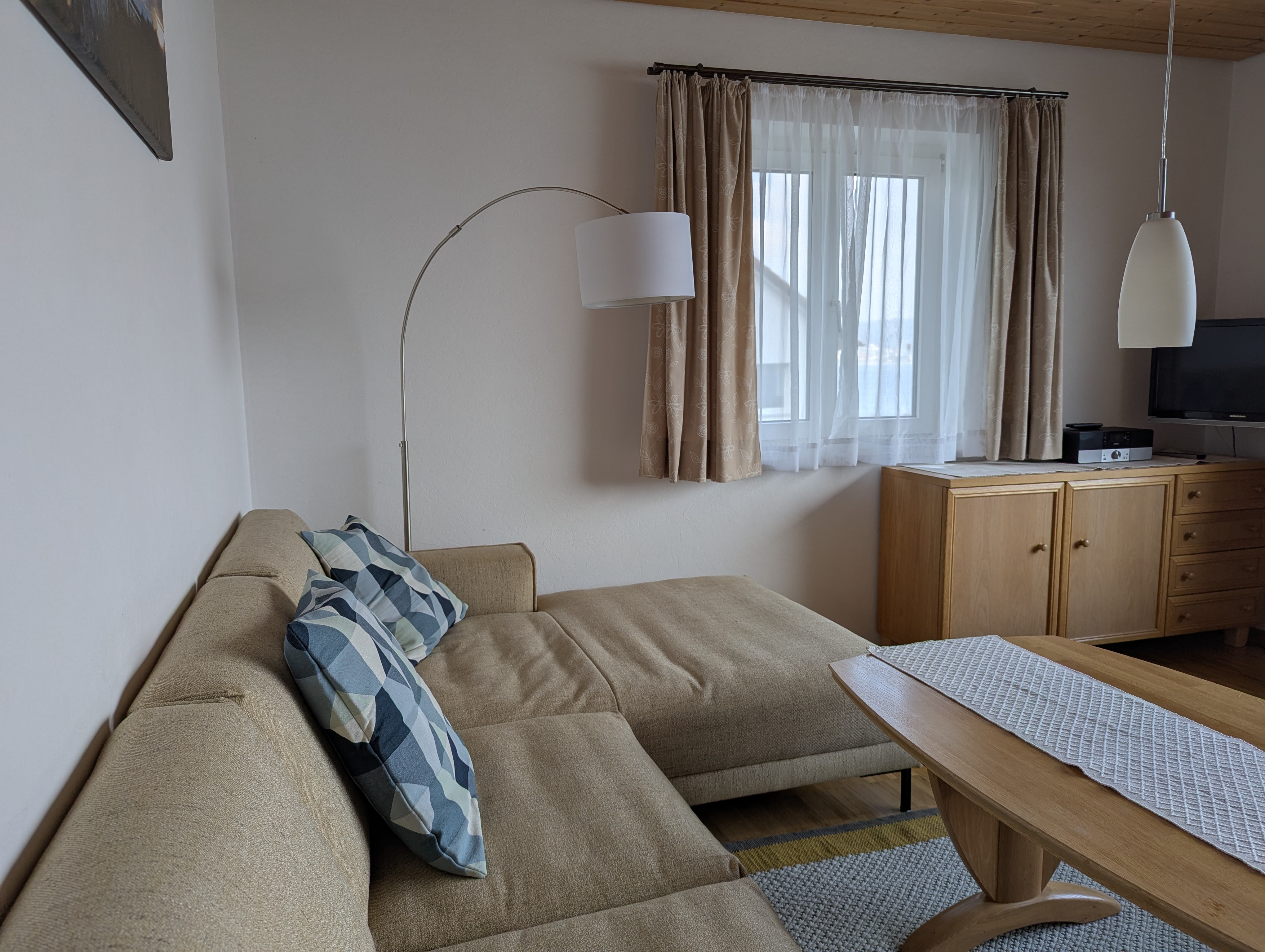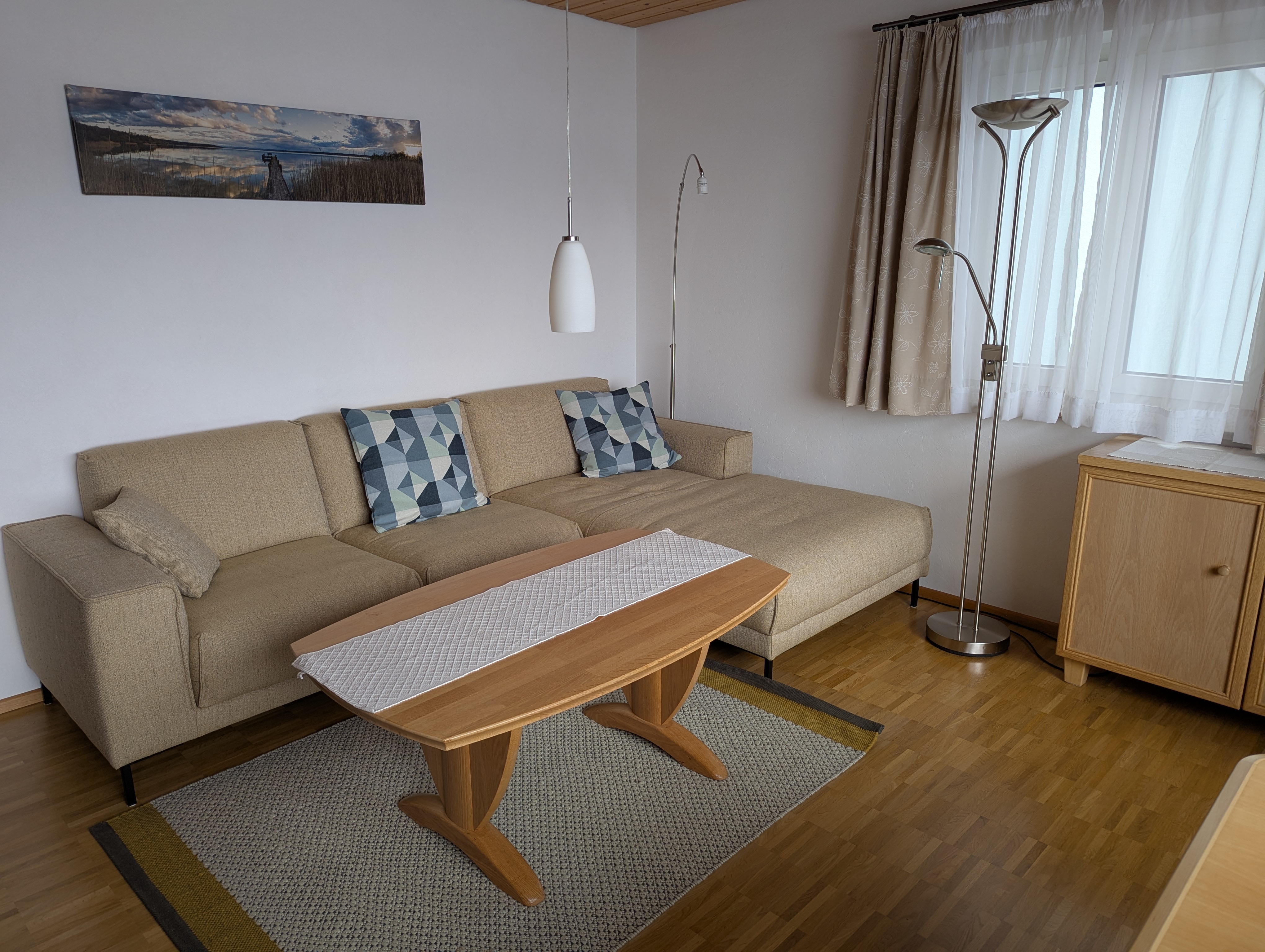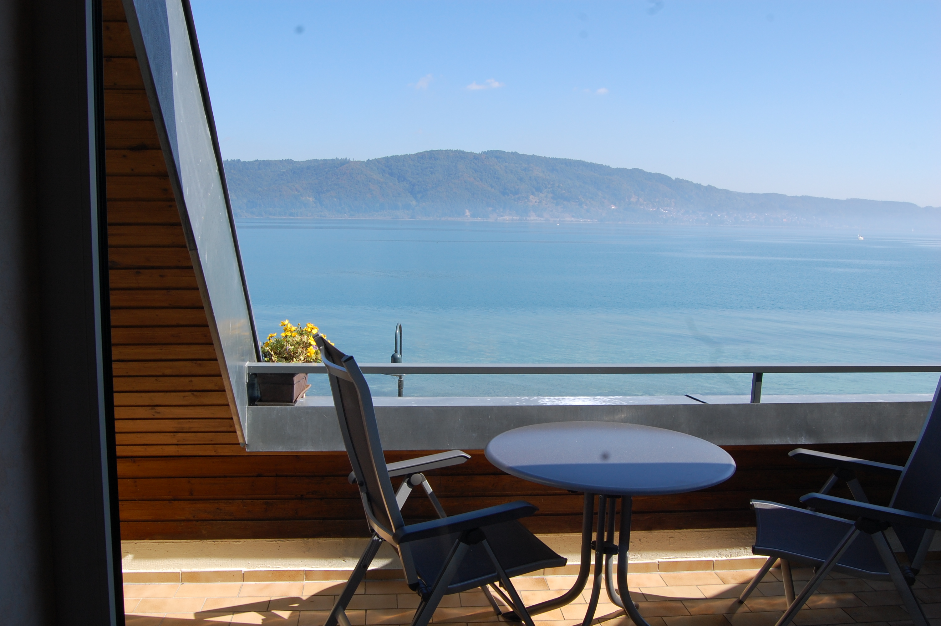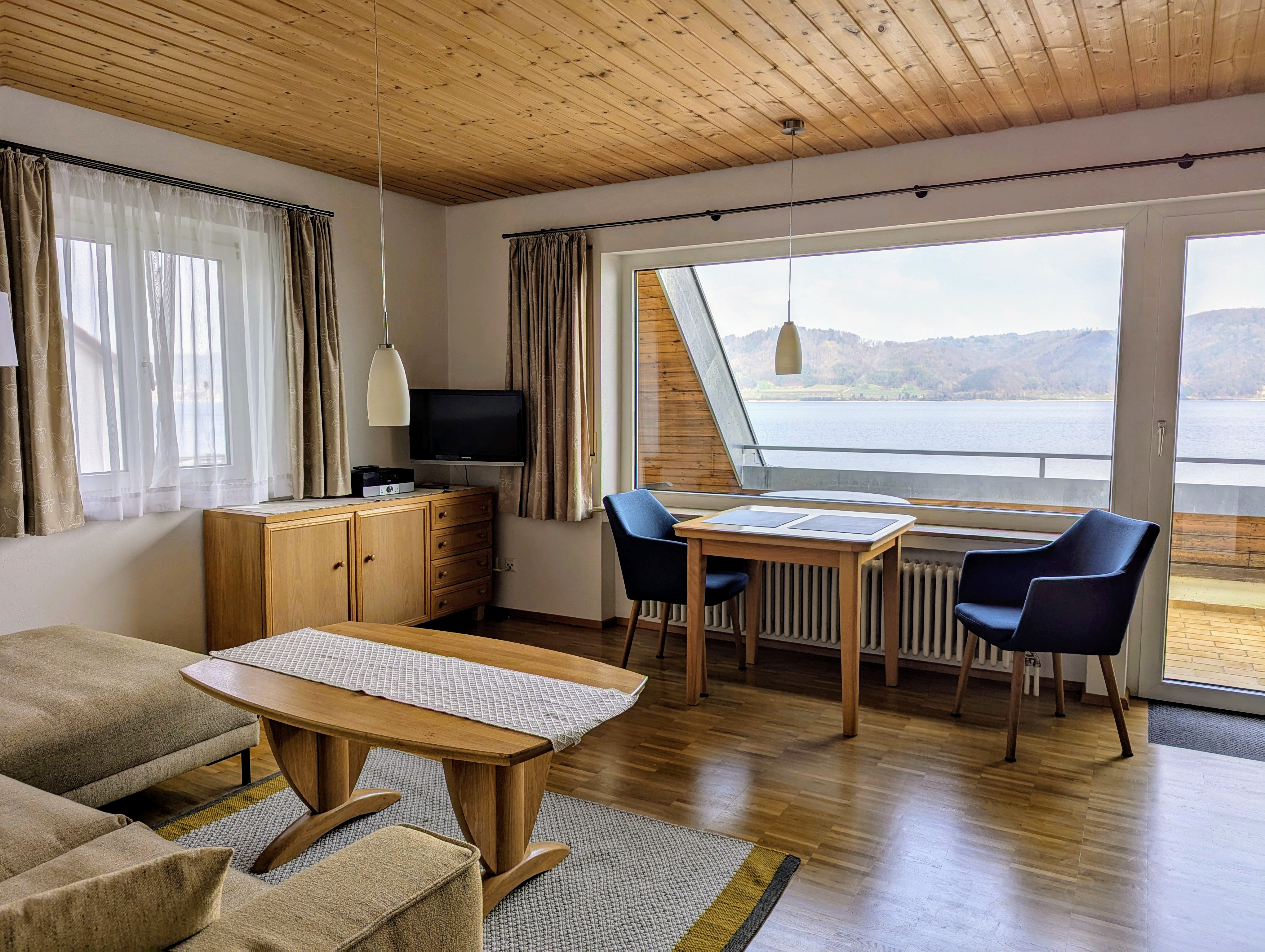 Diese Wohnung ist für 2 Personen geeignet. Sie beinhaltet einen Wohn- und Essraum mit Küchenzeile und großem Panoramafenster zum See, ein Schlafzimmer mit Doppelbett sowie ein Badezimmer mit großem Waschtisch, Echtglasduschkabine und WC. In der gemütlichen Dachloggia sitzen Sie ganz ungestört und windgeschützt und können den immer wieder neuen, herrlichen Blick über das Wasser genießen. Seezugang direkt vom Haus.